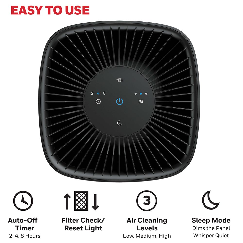 Filtration begins at the first level with a vacuumable Pre-Filter designed to capture larger airborne particles. Next, the certified HEPA Filter acts as the second level, capturing up to 99.97% of microscopic airborne allergens and particles, including dust, pollen, pet dander, dust mite debris, and smoke as small as 0.3 microns or larger, from the air that passes through. Finally, the third level uses an Activated Carbon Filter for effective odor reduction, ensuring the released air is clean and fresh. For optimal cleaning performance, replace your HEPA filter every 12 months. The filter check/reset light on the HPA120 Air Cleaner will remind you when it's time to change your filter. Initial filter included.