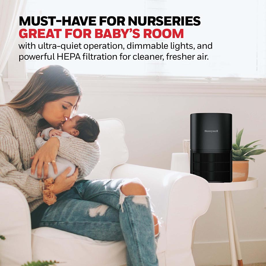 Bring cleaner air into your home with the Honeywell Compact Air Purifier, featuring a sleek design that fits easily onto any tabletop without taking up too much space. Ideal for personal areas, this air purifier is perfect for a baby’s nursery, bedroom, or small office. Equipped with powerful HEPA filtration, it's engineered to help capture up to 99.97% of microscopic airborne allergens and particles, including dust, pollen, pet dander, dust mite debris, and smoke.1 A dedicated Pre-Carbon filter works to reduce common household odors like cooking smells, paint fumes, VOCs (volatile organic compounds), and even wildfire smoke, ensuring the air you breathe is noticeably fresher.