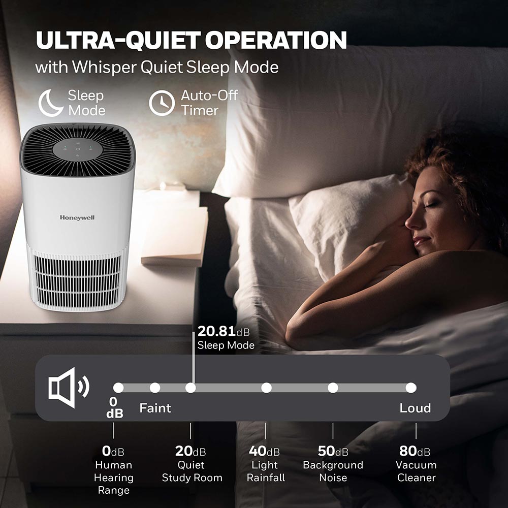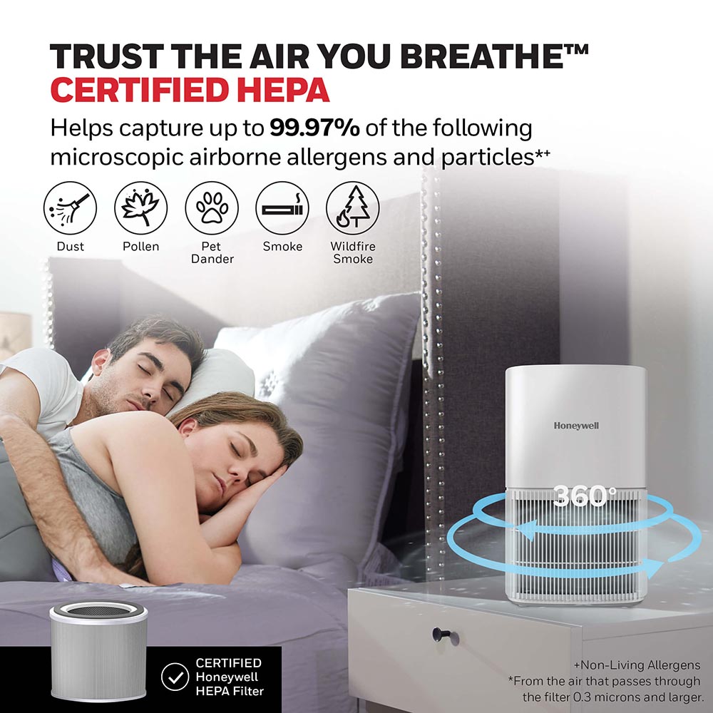 Bring cleaner air into your home with the Honeywell Compact Air Purifier, featuring a sleek design that fits easily onto any tabletop without taking up too much space. Ideal for personal areas, this air purifier is perfect for a baby’s nursery, bedroom, or small office. Equipped with powerful HEPA filtration, it's engineered to help capture up to 99.97% of microscopic airborne allergens and particles, including dust, pollen, pet dander, dust mite debris, and smoke.1 A dedicated Pre-Carbon filter works to reduce common household odors like cooking smells, paint fumes, VOCs (volatile organic compounds), and even wildfire smoke, ensuring the air you breathe is noticeably fresher.