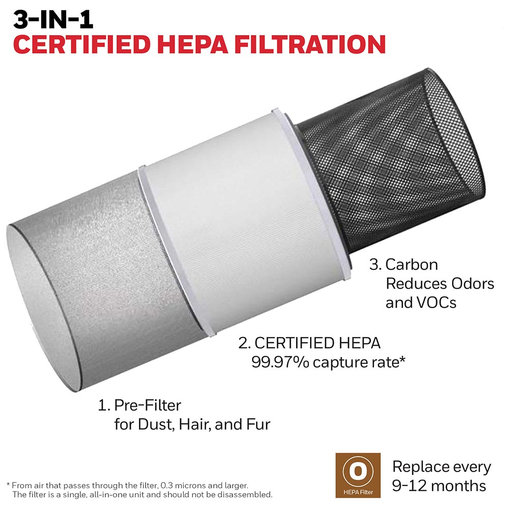 Filtration begins at the first level with a vacuumable Pre-Filter designed to capture larger airborne particles. Next, the certified HEPA Filter acts as the second level, capturing up to 99.97% of microscopic airborne allergens and particles, including dust, pollen, pet dander, dust mite debris, and smoke as small as 0.3 microns or larger, from the air that passes through. Finally, the third level uses an Activated Carbon Filter for effective odor reduction, ensuring the released air is clean and fresh. For optimal cleaning performance, replace your HEPA filter every 12 months. The filter check/reset light on the HPA120 Air Cleaner will remind you when it's time to change your filter. Initial filter included.