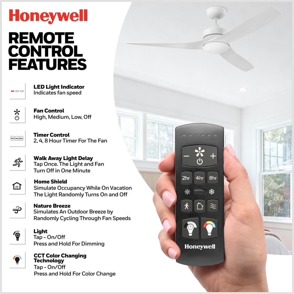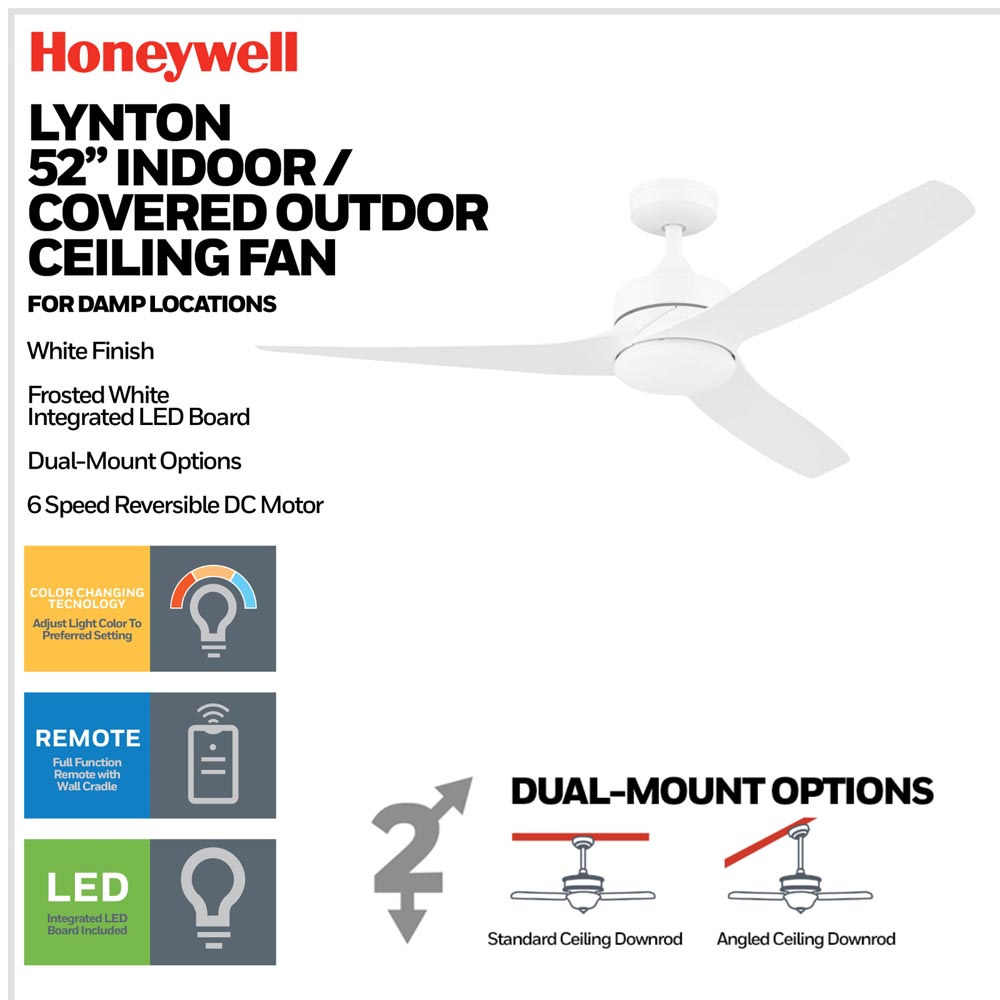 Honeywell Lynton Dual Mount Ceiling Fan with Light, 52 Inch, White - 53050