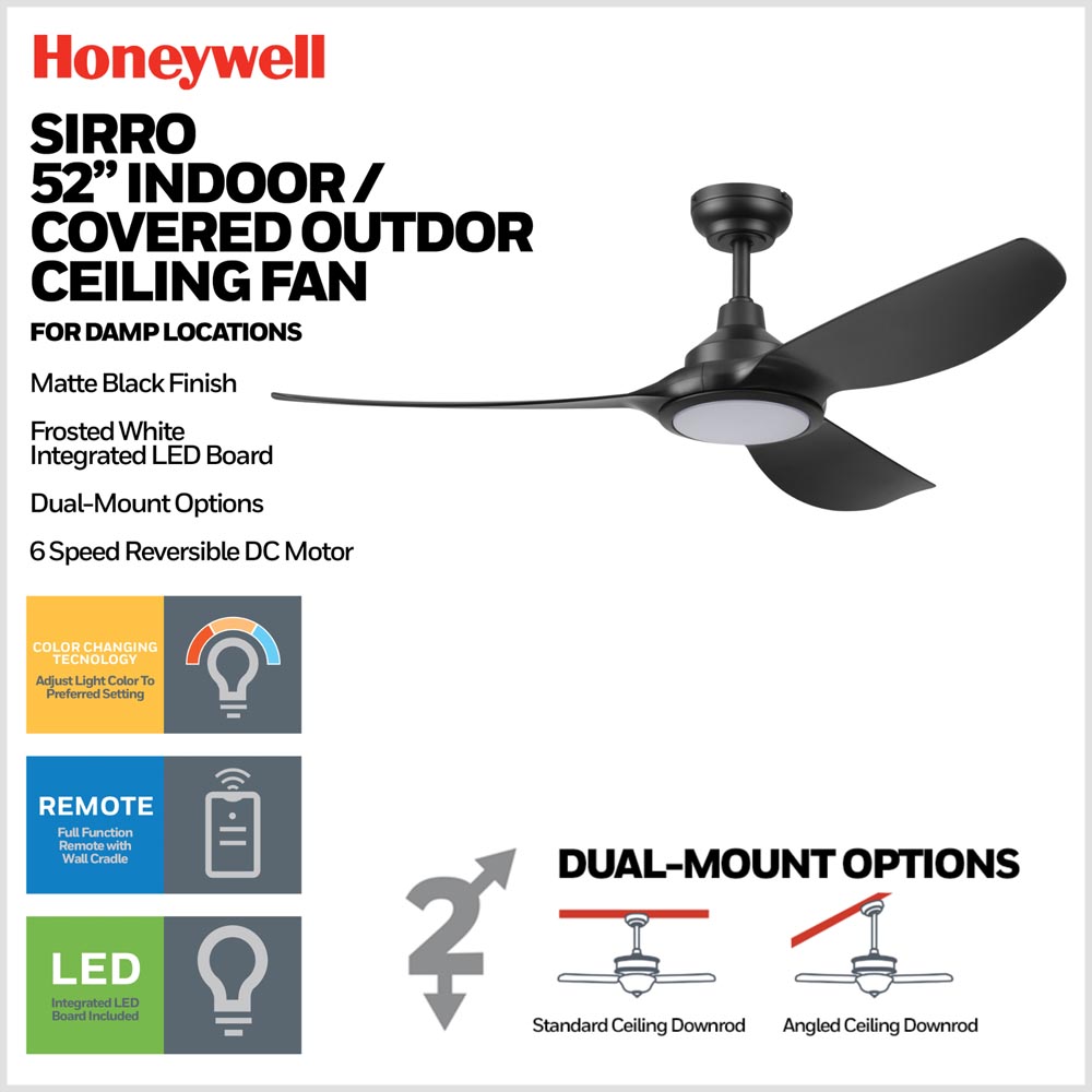 Damp rated for covered outdoor use and equipped with stainless steel hardware, Sirro is built for durability and long-term reliability. Dual-mount installation and the included remote control make setup and daily operation effortless. Whether installed indoors or on a covered patio, the Honeywell Sirro ceiling fan offers refined design, customizable lighting, and efficient performance in one complete solution.