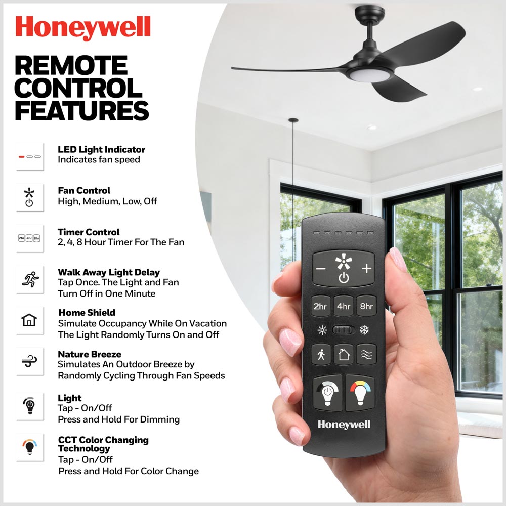 The Honeywell Sirro 52-inch ceiling fan delivers modern performance and everyday versatility for bedrooms, living rooms, and covered outdoor spaces. Designed with clean lines and a streamlined three-blade profile, Sirro blends contemporary style with advanced airflow technology.
