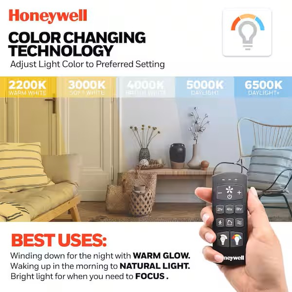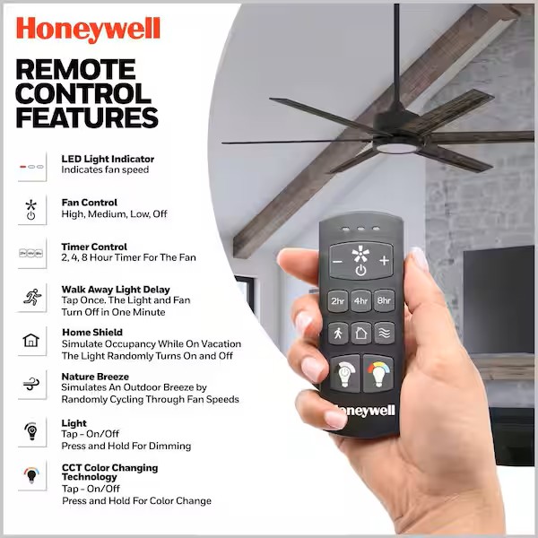 Honeywell Ceiling Fans feature a collection of fans in various sizes and specifications to ensure your choice of indoor or outdoor fan delivers optimum performance for your room's size. You can trust the quality of Honeywell Ceiling Fans to deliver maximum airflow and a stylish lighting option. Honeywell Ceiling Fans use high-quality materials that are long lasting and durable with satisfaction guaranteed by the manufacturer's limited lifetime warranty.